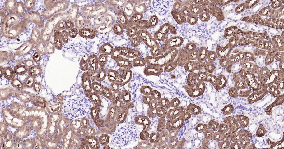 Paraformaldehyde-fixed, paraffin embedded Mouse Kidney; Antigen retrieval by boiling in sodium citrate buffer (pH6.0) for 15 min; Antibody incubation with Argininosuccinate synthase 1 Monoclonal Antibody, Unconjugated(bsm-62194R) at 1:200 overnight at 4°C, followed by conjugation to the bs-0295G-HRP and DAB (C-0010) staining.