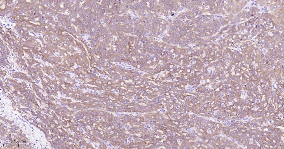 Paraformaldehyde-fixed, paraffin embedded Human Ovarian Cancer; Antigen retrieval by boiling in sodium citrate buffer (pH6.0) for 15 min; Antibody incubation with Argininosuccinate synthase 1 Monoclonal Antibody, Unconjugated(bsm-62194R) at 1:200 overnight at 4°C, followed by conjugation to the bs-0295G-HRP and DAB (C-0010) staining.