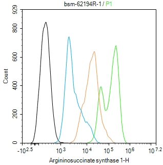 The HepG2 (H) cells were fixed with 4% PFA (10 min at r.t.) and then permeabilized with 90% ice-cold methanol for 20 min at -20℃,the cells then were incubated in 5%BSA to block non-specific protein-protein interactions (30 min at r.t.).Primary Antibody (green):Rabbit Anti-Argininosuccinate synthase 1 antibody (bsm-62194R,1:100); Secondary Antibody (white blue): Goat anti-Rabbit IgG-BF488 (bs-60295G-BF488): 1 μg/test. Isotype Control (orange): Rabbit IgG (bs-0295P). Blank control (black): PBS. Acquisition of 20,000 events was performed.