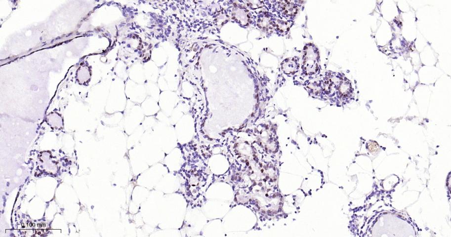 Paraformaldehyde-fixed, paraffin embedded Mouse Breast; Antigen retrieval by boiling in sodium citrate buffer (pH6.0) for 15 min; The section was incubated with AP2 alpha Monoclonal Antibody, Unconjugated (bsm-62206R) at 1:200 overnight at 4°C, followed by conjugation to the bs-0295G-HRP and DAB (C-0010) staining.