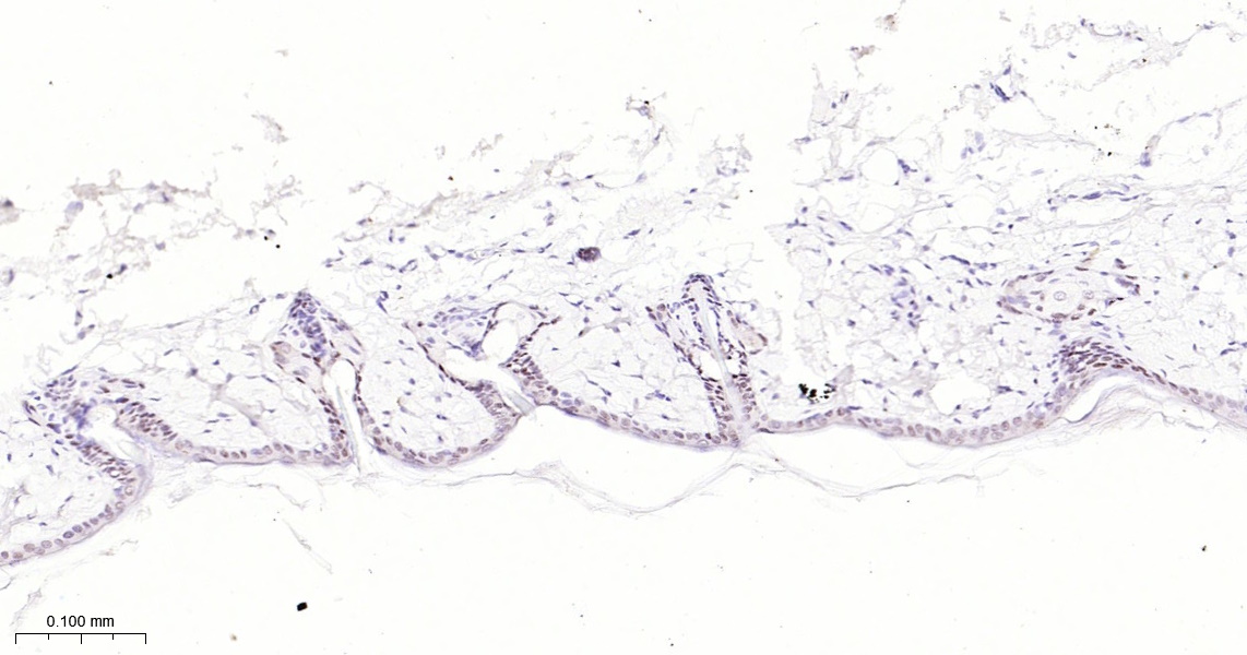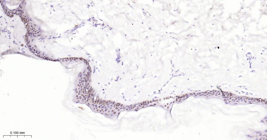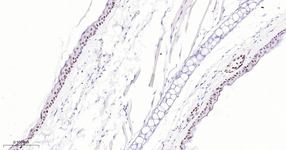 Paraformaldehyde-fixed, paraffin embedded Mouse Skin; Antigen retrieval by boiling in sodium citrate buffer (pH6.0) for 15 min; The section was incubated with AP2 alpha Monoclonal Antibody, Unconjugated (bsm-62206R) at 1:200 overnight at 4°C, followed by conjugation to the bs-0295G-HRP and DAB (C-0010) staining.