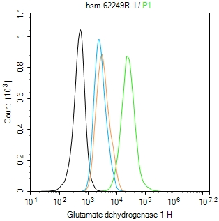 The HepG2 (H) cells were fixed with 4% PFA (10 min at r.t.) and then permeabilized with 90% ice-cold methanol for 20 min at -20℃,the cells then were incubated in 5%BSA to block non-specific protein-protein interactions (30 min at r.t.).Primary Antibody (green):Rabbit Anti-Glutamate dehydrogenase 1 antibody (bsm-62249R,1:100); Secondary Antibody (white blue): Goat anti-Rabbit IgG-BF488 (bs-60295G-BF488): 1 μg/test. Isotype Control (orange): Rabbit IgG (bs-0295P). Blank control (black): PBS. Acquisition of 20,000 events was performed.