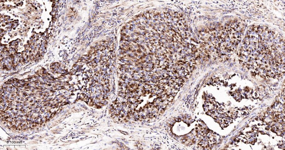 Paraformaldehyde-fixed, paraffin embedded Human Prostate Cancer; Antigen retrieval by boiling in sodium citrate buffer (pH6.0) for 15 min; The section was incubated with Glutamate dehydrogenase 1 Monoclonal Antibody, Unconjugated (bsm-62249R) at 1:200 overnight at 4°C, followed by conjugation to the bs-0295G-HRP and DAB (C-0010) staining.