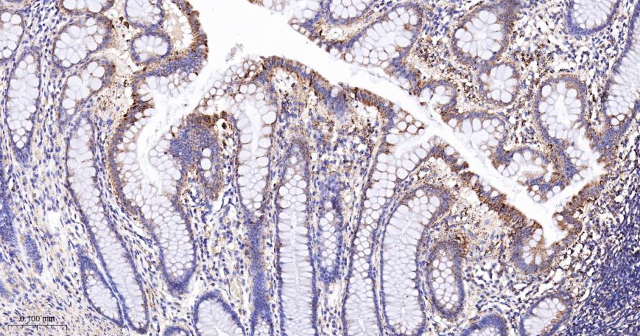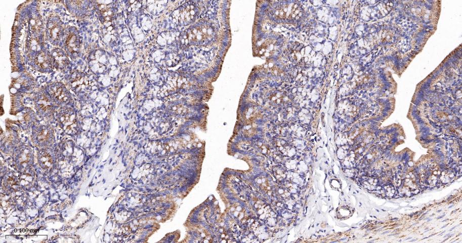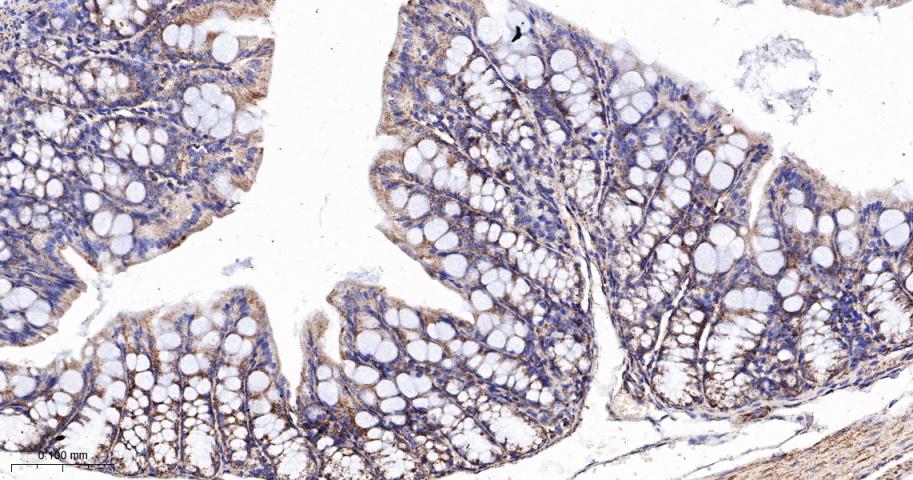 Paraformaldehyde-fixed, paraffin embedded Mouse Colon; Antigen retrieval by boiling in sodium citrate buffer (pH6.0) for 15 min; The section was incubated with Glutamate dehydrogenase 1 Monoclonal Antibody, Unconjugated (bsm-62249R) at 1:200 overnight at 4°C, followed by conjugation to the bs-0295G-HRP and DAB (C-0010) staining.