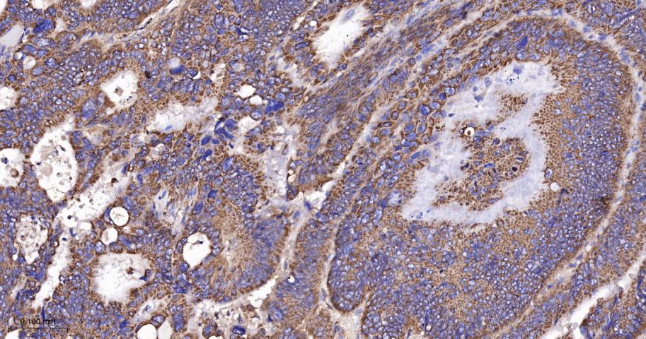 Paraformaldehyde-fixed, paraffin embedded Human Colon Cancer; Antigen retrieval by boiling in sodium citrate buffer (pH6.0) for 15 min; The section was incubated with Glutamate dehydrogenase 1 Monoclonal Antibody, Unconjugated (bsm-62249R) at 1:200 overnight at 4°C, followed by conjugation to the bs-0295G-HRP and DAB (C-0010) staining.
