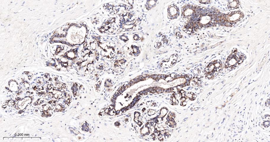 Paraformaldehyde-fixed, paraffin embedded Human Breast Cancer; Antigen retrieval by boiling in sodium citrate buffer (pH6.0) for 15 min; The section was incubated with Glutamate dehydrogenase 1 Monoclonal Antibody, Unconjugated (bsm-62249R) at 1:200 overnight at 4°C, followed by conjugation to the bs-0295G-HRP and DAB (C-0010) staining.