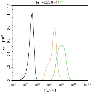 The Hela (H) cells were fixed with 4% PFA (10 min at r.t.) and then permeabilized with 90% ice-cold methanol for 20 min at -20℃,the cells then were incubated in 5%BSA to block non-specific protein-protein interactions (30 min at r.t.),followed by secondary antibody incubation for 40 min at room temperature. Primary Antibody (green):Rabbit Anti-PSAP antibody (bsm-62251R,1:100); Isotype Control (orange): Rabbit IgG (bs-0295P). Blank control (black): PBS. Acquisition of 20,000 events was performed.