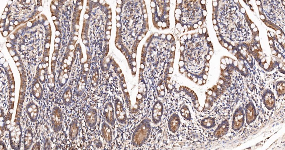Paraformaldehyde-fixed, paraffin embedded Human Small Intestine; Antigen retrieval by boiling in sodium citrate buffer (pH6.0) for 15 min; The section was incubated with Arginase2 Monoclonal Antibody, Unconjugated (bsm-62356R) at 1:200 overnight at 4°C, followed by conjugation to the bs-0295G-HRP and DAB (C-0010) staining.