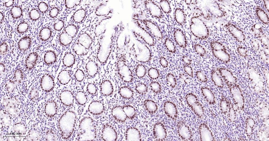 Paraformaldehyde-fixed, paraffin embedded Mouse Stomach; Antigen retrieval by boiling in sodium citrate buffer (pH6.0) for 15 min; The section was incubated with CTBP2? Monoclonal Antibody, Unconjugated (bsm-62448R) at 1:200 overnight at 4°C, followed by conjugation to the bs-0295G-HRP and DAB (C-0010) staining.