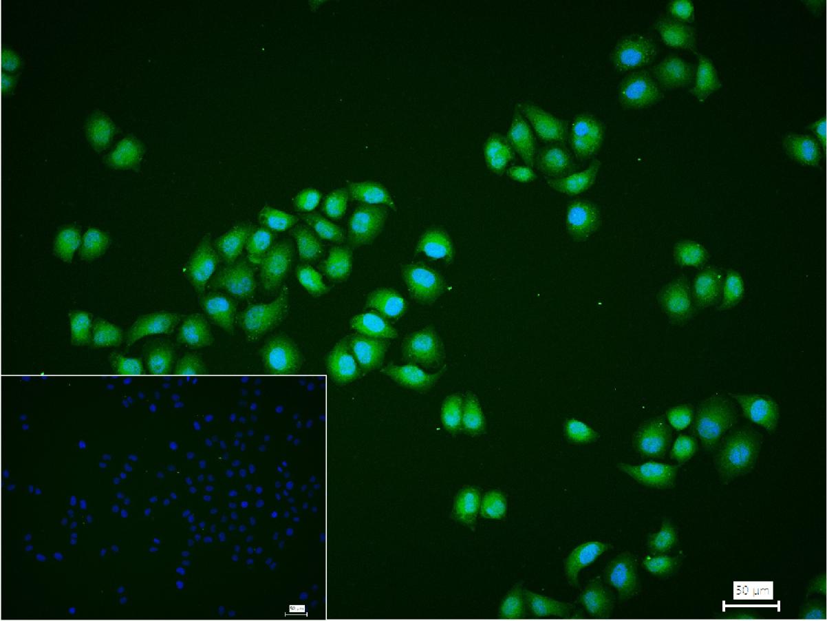 4% Paraformaldehyde-fixed Hela (H) cell; Triton X-100 at r.t. for 20 min; Antibody incubation with (PHD3 ) monoclonal Antibody, unconjugated (bsm-62480R) 1:100, 90 min at 37°C; followed by conjugated Goat Anti-Rabbit IgG antibody (green, bs-40295G-FITC) at 37°C for 90 min, DAPI (blue, C02-04002) was used to stain the cell nuclei. PBS instead of the primary antibody was used as the blank control.