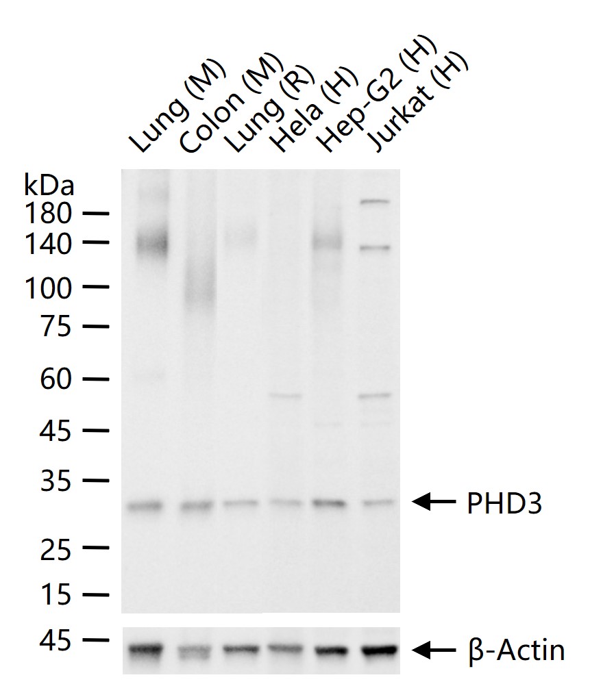 25 ug total protein per lane of various lysates (see on figure) probed with PHD3 monoclonal antibody, unconjugated (bsm-62480R) at 1:1000 dilution and 4°C overnight incubation. Followed by conjugated secondary antibody incubation at r.t. for 60 min.