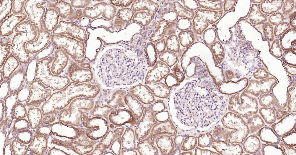 Paraformaldehyde-fixed, paraffin embedded Human Kidney; Antigen retrieval by boiling in sodium citrate buffer (pH6.0) for 15 min; Antibody incubation with OPG? Monoclonal Antibody, Unconjugated(bsm-62482R) at 1:200 overnight at 4°C, followed by conjugation to the bs-0295G-HRP and DAB (C-0010) staining and DAB (C-0010) staining.