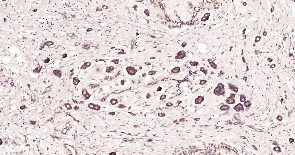Paraformaldehyde-fixed, paraffin embedded Human Breast Cancer; Antigen retrieval by boiling in sodium citrate buffer (pH6.0) for 15 min; Antibody incubation with OPG? Monoclonal Antibody, Unconjugated(bsm-62482R) at 1:200 overnight at 4°C, followed by conjugation to the bs-0295G-HRP and DAB (C-0010) staining and DAB (C-0010) staining.