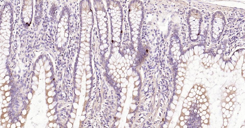 Paraformaldehyde-fixed, paraffin embedded Human Small Intestine; Antigen retrieval by boiling in sodium citrate buffer (pH6.0) for 15 min; Antibody incubation with OPG? Monoclonal Antibody, Unconjugated(bsm-62482R) at 1:200 overnight at 4°C, followed by conjugation to the bs-0295G-HRP and DAB (C-0010) staining and DAB (C-0010) staining.