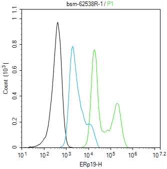 The HepG2 (H) cells were fixed with 4% PFA (10 min at r.t.) and then permeabilized with 90% ice-cold methanol for 20 min at -20℃,the cells then were incubated in 5%BSA to block non-specific protein-protein interactions (30 min at r.t.).Primary Antibody (green):Rabbit Anti-ERp19 antibody (bsm-62538R;1:100); Secondary Antibody (white blue): Goat anti-Rabbit IgG-BF488 (bs-60295G-BF488): 1 μg/test. Blank control (black): PBS. Acquisition of 20,000 events was performed.