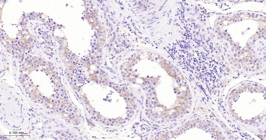 Paraformaldehyde-fixed, paraffin embedded Human Testicles; Antigen retrieval by boiling in sodium citrate buffer (pH6.0) for 15 min; The section was incubated with Syntaxin 16 Recombinant Monoclonal Antibody, Unconjugated (bsm-62548R) at 1:200 overnight at 4°C, followed by conjugation to the bs-0295G-HRP and DAB (C-0010) staining.
