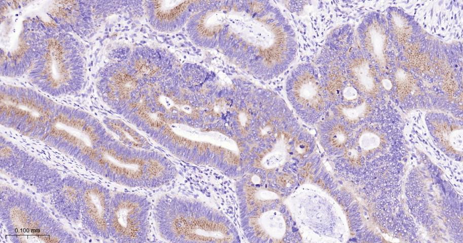 Paraformaldehyde-fixed, paraffin embedded Human Colon Cancer; Antigen retrieval by boiling in sodium citrate buffer (pH6.0) for 15 min; The section was incubated with Syntaxin 16 Recombinant Monoclonal Antibody, Unconjugated (bsm-62548R) at 1:200 overnight at 4°C, followed by conjugation to the bs-0295G-HRP and DAB (C-0010) staining.