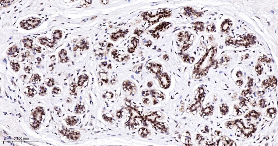 Paraformaldehyde-fixed, paraffin embedded Human Prostate; Antigen retrieval by boiling in sodium citrate buffer (pH6.0) for 15 min; The section was incubated with Bag1 Monoclonal Antibody, Unconjugated (bsm-62568R) at 1:200 overnight at 4°C, followed by conjugation to the bs-0295G-HRP and DAB (C-0010) staining.