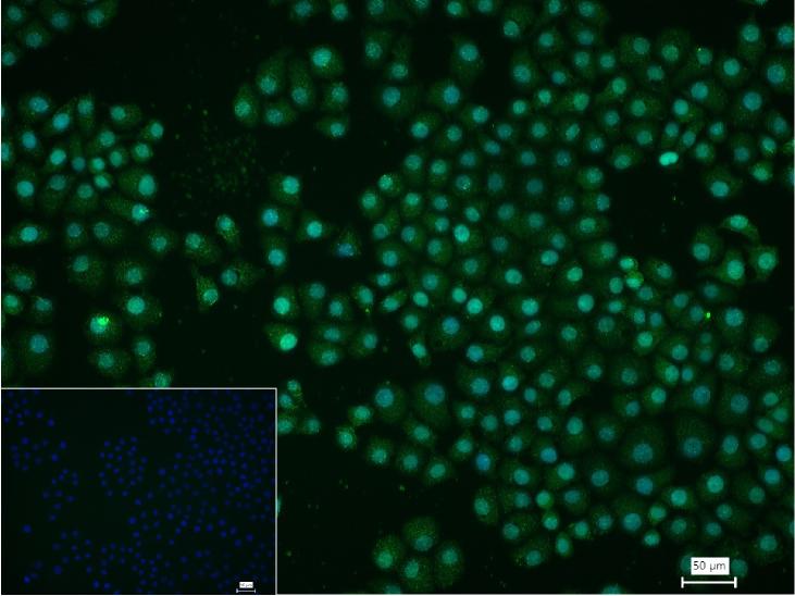 4% Paraformaldehyde-fixed HepG2 (H) cell; Triton X-100 at r.t. for 20 min; Antibody incubation with (HNF4A) monoclonal Antibody, unconjugated (bsm-62586R) 1:100, 90 min at 37°C; followed by conjugated Goat Anti-Rabbit IgG antibody (green, bs-60295G-FITC) at 37°C for 90 min, DAPI (blue, C02-04002) was used to stain the cell nuclei. PBS instead of the primary antibody was used as the blank control.