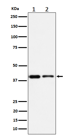 Western blot analysis of (1) Jurkat cell lysate; (2) RAW264.7 cell lysate. Using STOML2 (bsm-62593R) monoclonal antibody at 1:1000 dilution and 4°C overnight incubation. Followed by conjugated secondary antibody incubation at r.t. for 60 min.