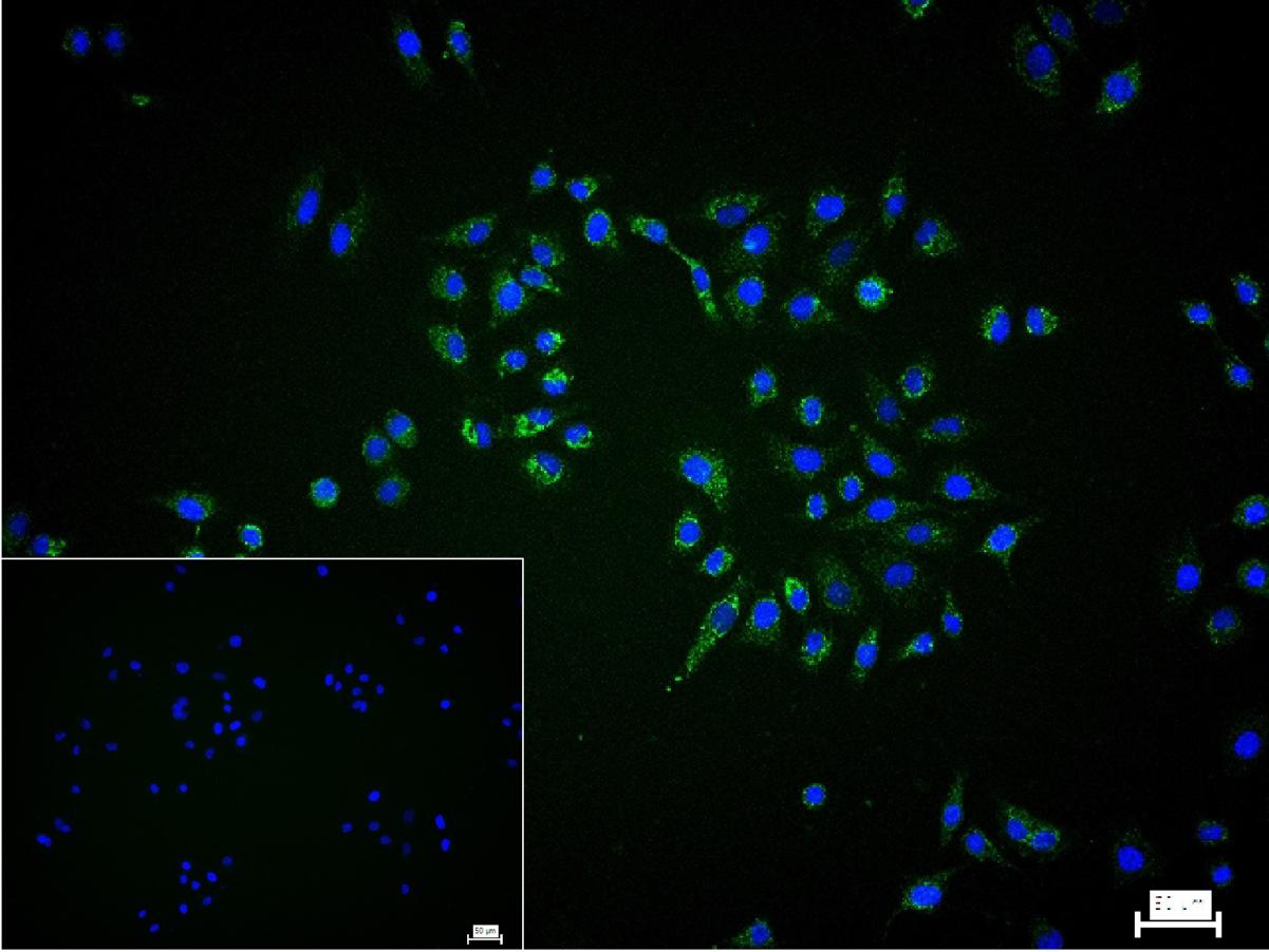 4% Paraformaldehyde-fixed A549 (H) cell; Triton X-100 at r.t. for 20 min; Antibody incubation with (STOML2) monoclonal Antibody, unconjugated (bsm-62593R) 1:100, 90 min at 37°C; followed by conjugated Goat Anti-Rabbit IgG antibody (green, bs-60295G-BF488) at 37°C for 90 min, DAPI (blue, C02-04002) was used to stain the cell nuclei. PBS instead of the primary antibody was used as the blank control.