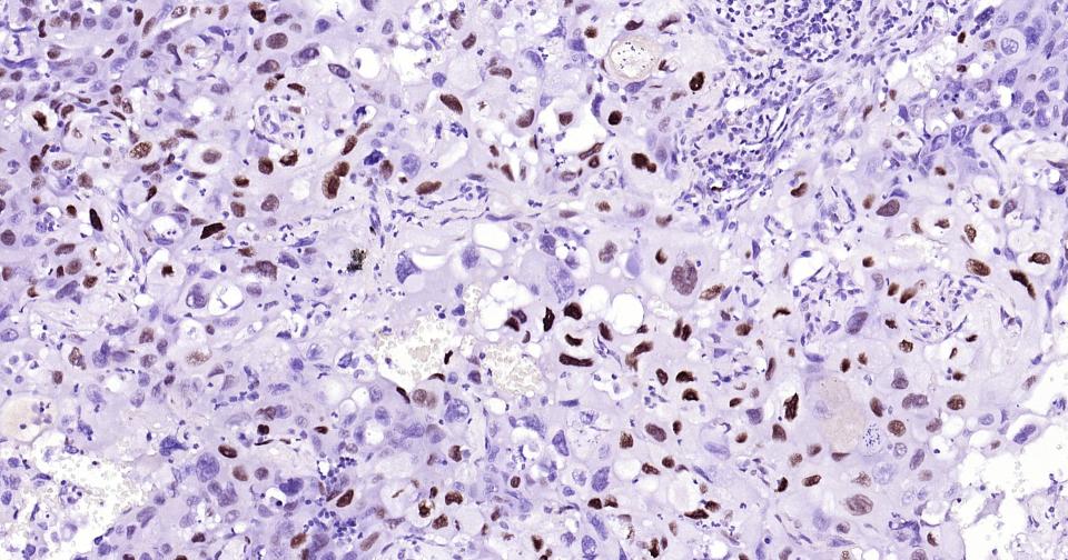 Paraformaldehyde-fixed, paraffin embedded Human Lung Cancer; Antigen retrieval by boiling in sodium citrate buffer (pH6.0) for 15 min; Antibody incubation with Phospho-c-Jun (Thr91+Thr93) Monoclonal Antibody, Unconjugated(bsm-62758R) at 1:200 overnight at 4°C, followed by conjugation to the bs-0295G-HRP and DAB (C-0010) staining.