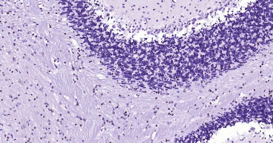 Paraformaldehyde-fixed, paraffin embedded Mouse Cerebellum; Antigen retrieval by boiling in sodium citrate buffer (pH6.0) for 15 min; Antibody incubation with Phospho-c-Jun (Thr91+Thr93) Monoclonal Antibody, Unconjugated(bsm-62758R) at 1:200 overnight at 4°C, followed by conjugation to the bs-0295G-HRP and DAB (C-0010) staining.