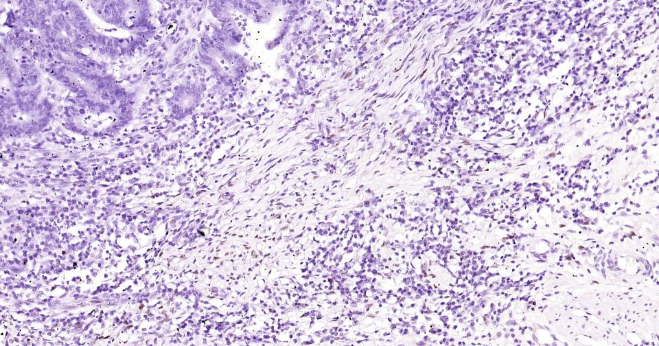 Paraformaldehyde-fixed, paraffin embedded Human Colon Cancer; Antigen retrieval by boiling in sodium citrate buffer (pH6.0) for 15 min; Antibody incubation with Phospho-c-Jun (Thr91+Thr93) Monoclonal Antibody, Unconjugated(bsm-62758R) at 1:200 overnight at 4°C, followed by conjugation to the bs-0295G-HRP and DAB (C-0010) staining.