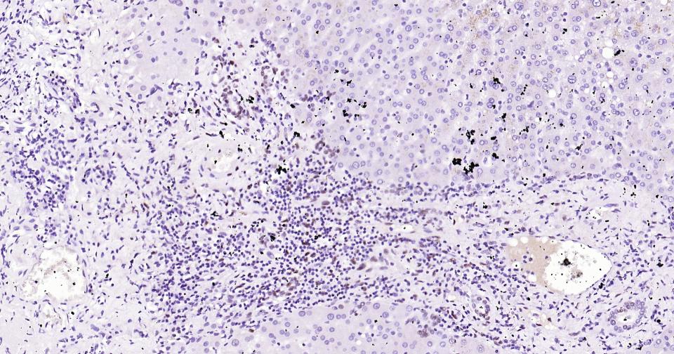 Paraformaldehyde-fixed, paraffin embedded Human Liver; Antigen retrieval by boiling in sodium citrate buffer (pH6.0) for 15 min; Antibody incubation with Phospho-c-Jun (Thr91+Thr93) Monoclonal Antibody, Unconjugated(bsm-62758R) at 1:200 overnight at 4°C, followed by conjugation to the bs-0295G-HRP and DAB (C-0010) staining.