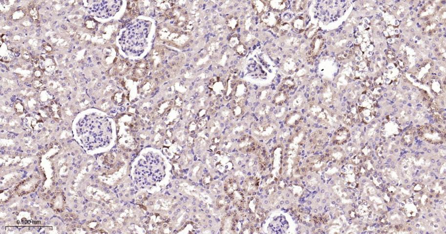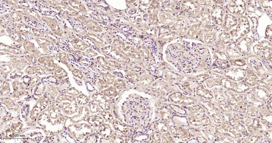 Paraformaldehyde-fixed, paraffin embedded Rat Kidney; Antigen retrieval by boiling in sodium citrate buffer (pH6.0) for 15 min; The section was incubated with IKK beta Monoclonal Antibody, Unconjugated (bsm-62794R) at 1:200 overnight at 4°C, followed by conjugation to the bs-0295G-HRP and DAB (C-0010) staining.