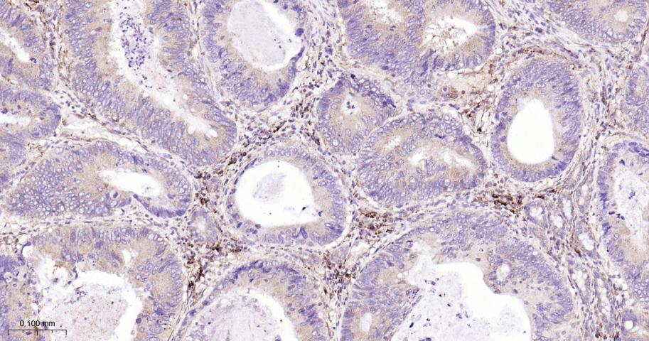 Paraformaldehyde-fixed, paraffin embedded Human Colon Cancer; Antigen retrieval by boiling in sodium citrate buffer (pH6.0) for 15 min; The section was incubated with IKK beta Monoclonal Antibody, Unconjugated (bsm-62794R) at 1:200 overnight at 4°C, followed by conjugation to the bs-0295G-HRP and DAB (C-0010) staining.