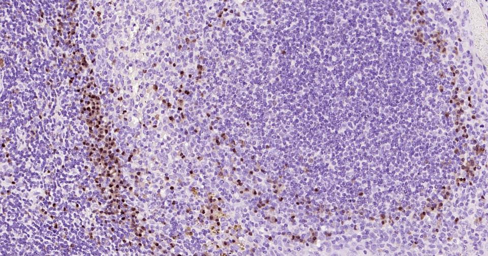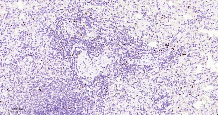 Paraformaldehyde-fixed, paraffin embedded Human Spleen; Antigen retrieval by boiling in sodium citrate buffer (pH6.0) for 15 min; Antibody incubation with IRF4 Monoclonal Antibody, Unconjugated(bsm-62837R) at 1:200 overnight at 4°C, followed by conjugation to the bs-0295G-HRP and DAB (C-0010) staining.