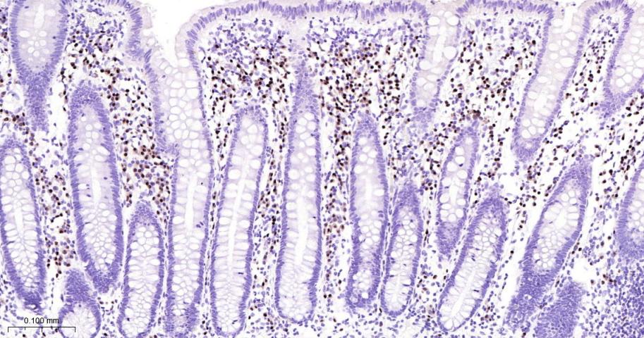 Paraformaldehyde-fixed, paraffin embedded Human Colon; Antigen retrieval by boiling in sodium citrate buffer (pH6.0) for 15 min; Antibody incubation with IRF4 Monoclonal Antibody, Unconjugated(bsm-62837R) at 1:200 overnight at 4°C, followed by conjugation to the bs-0295G-HRP and DAB (C-0010) staining.