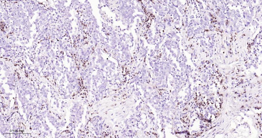 Paraformaldehyde-fixed, paraffin embedded Human Lung Cancer; Antigen retrieval by boiling in sodium citrate buffer (pH6.0) for 15 min; Antibody incubation with IRF4 Monoclonal Antibody, Unconjugated(bsm-62837R) at 1:200 overnight at 4°C, followed by conjugation to the bs-0295G-HRP and DAB (C-0010) staining.