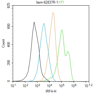 The KARPAS-299 (H) cells were fixed with 4% PFA (10 min at r.t.) and then permeabilized with 90% ice-cold methanol for 20 min at -20℃,the cells then were incubated in 5%BSA to block non-specific protein-protein interactions (30 min at r.t.).Primary Antibody (green):Rabbit Anti-IRF4 antibody (bsm-62837R,1:100); Secondary Antibody (white blue): Goat anti-Rabbit IgG-BF488 (bs-60295G-BF488): 1 μg/test. Isotype Control (orange): Rabbit IgG (bs-0295P). Blank control (black): PBS. Acquisition of 20,000 events was performed.