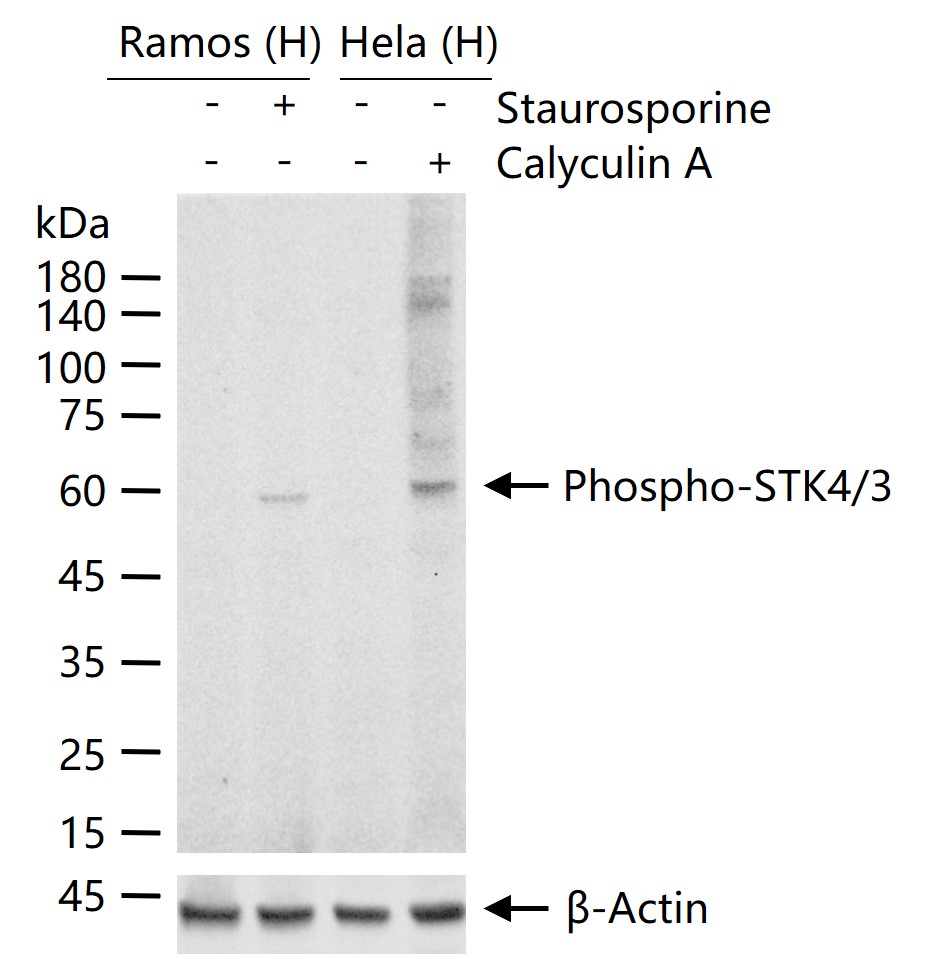Ramos (H) cells were treated with or without Staurosporine (1μM) for 1h, Hela (H) cells were treated with or without Calyculin A (50nM) for 30 min, 25 μg total protein per lane of cell lysates (see on figure) probed with Phospho-STK4/3 monoclonal antibody, unconjugated (bsm-62840R) at 1:1000 dilution and 4°C overnight incubation. Followed by conjugated secondary antibody incubation at r.t. for 60 min.