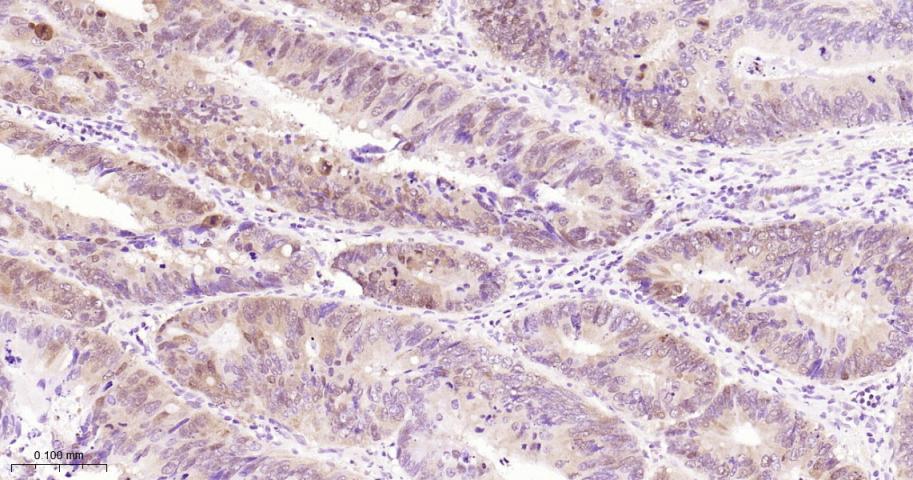 Paraformaldehyde-fixed, paraffin embedded Human Colon Cancer; Antigen retrieval by boiling in sodium citrate buffer (pH6.0) for 15 min; The section was incubated with Phospho-eIF4EBP1/2/3(Thr46/Thr46/Thr32) Monoclonal Antibody, Unconjugated (bsm-62853R) at 1:200 overnight at 4°C, followed by conjugation to the bs-0295G-HRP and DAB (C-0010) staining.