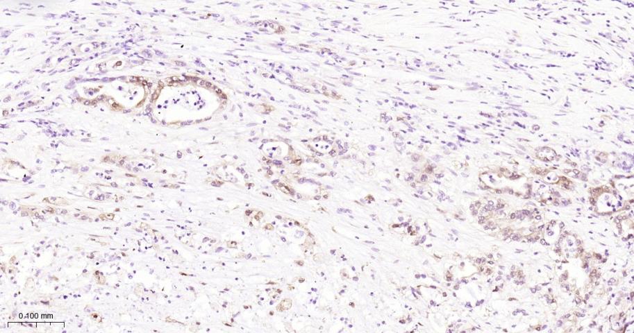 Paraformaldehyde-fixed, paraffin embedded Human Pancreatic Cancer; Antigen retrieval by boiling in sodium citrate buffer (pH6.0) for 15 min; The section was incubated with Phospho-eIF4EBP1/2/3(Thr46/Thr46/Thr32) Monoclonal Antibody, Unconjugated (bsm-62853R) at 1:200 overnight at 4°C, followed by conjugation to the bs-0295G-HRP and DAB (C-0010) staining.