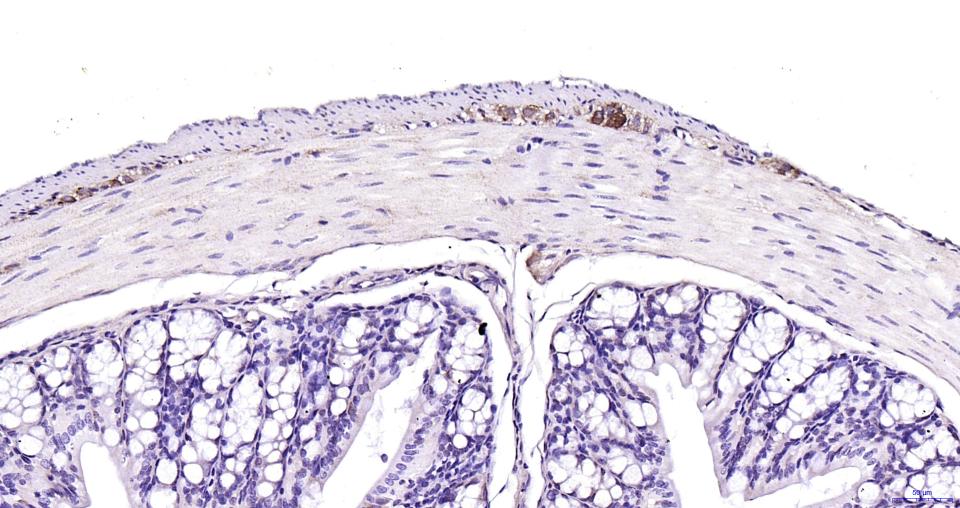 Paraformaldehyde-fixed, paraffin embedded Mouse colon; Antigen retrieval by boiling in sodium citrate buffer (pH6.0) for 15 min; Antibody incubation with Phospho-MAP2 (Ser136) Monoclonal Antibody, Unconjugated (bsm-62863R) at 1:200 overnight at 4°C, followed by conjugation to the bs-0295G-HRP and DAB (C-0010) staining.