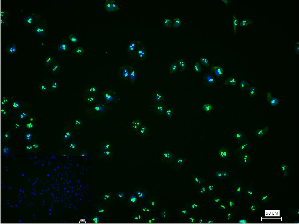 4% Paraformaldehyde-fixed MCF-7 (H) cell; Triton X-100 at r.t. for 20 min; Antibody incubation with (Nucleolin) monoclonal Antibody, unconjugated (bsm-62918R) 1:100, 90 min at 37°C; followed by conjugated Goat Anti-Rabbit IgG antibody (green, bs-40295G-FITC) at 37°C for 90 min, DAPI (blue, C02-04002) was used to stain the cell nuclei. PBS instead of the primary antibody was used as the blank control.