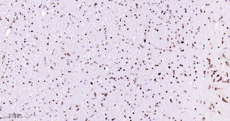 Paraformaldehyde-fixed, paraffin embedded Human Cerebrum; Antigen retrieval by boiling in sodium citrate buffer (pH6.0) for 15 min; The section was incubated with Nucleolin Monoclonal Antibody, Unconjugated (bsm-62918R) at 1:200 overnight at 4°C, followed by conjugation to the bs-0295G-HRP and DAB (C-0010) staining.