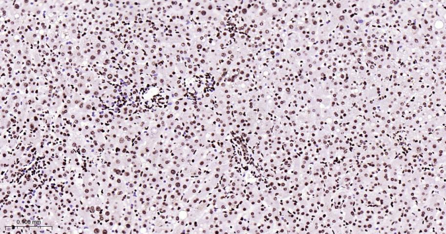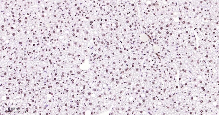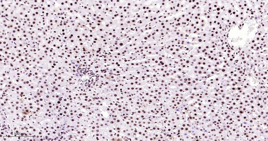 Paraformaldehyde-fixed, paraffin embedded Mouse Liver; Antigen retrieval by boiling in sodium citrate buffer (pH6.0) for 15 min; The section was incubated with Nucleolin Monoclonal Antibody, Unconjugated (bsm-62918R) at 1:200 overnight at 4°C, followed by conjugation to the bs-0295G-HRP and DAB (C-0010) staining.