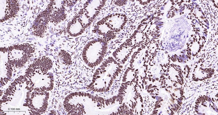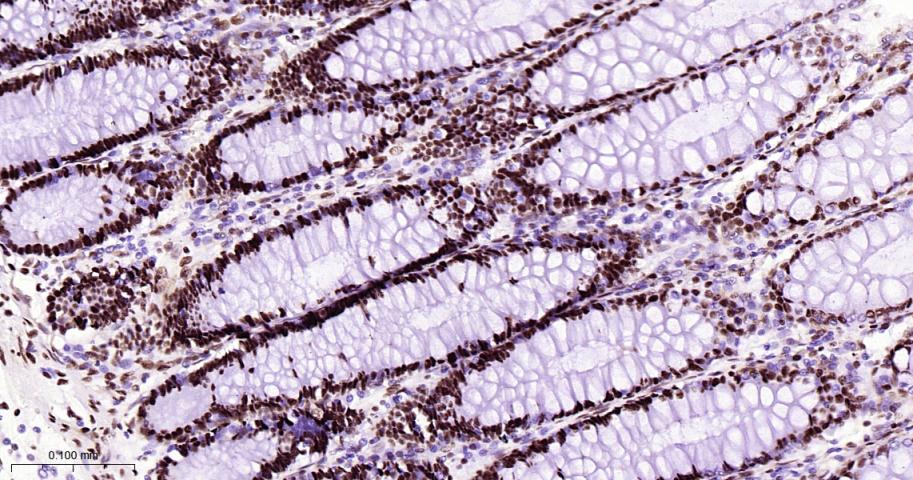 Paraformaldehyde-fixed, paraffin embedded Human Colon; Antigen retrieval by boiling in sodium citrate buffer (pH6.0) for 15 min; The section was incubated with Nucleolin Monoclonal Antibody, Unconjugated (bsm-62918R) at 1:200 overnight at 4°C, followed by conjugation to the bs-0295G-HRP and DAB (C-0010) staining.