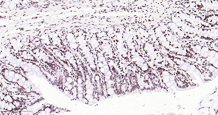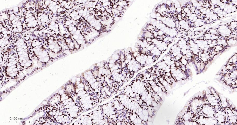 Paraformaldehyde-fixed, paraffin embedded Mouse Colon; Antigen retrieval by boiling in sodium citrate buffer (pH6.0) for 15 min; The section was incubated with Nucleolin Monoclonal Antibody, Unconjugated (bsm-62918R) at 1:200 overnight at 4°C, followed by conjugation to the bs-0295G-HRP and DAB (C-0010) staining.
