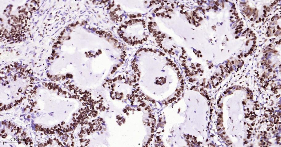 Paraformaldehyde-fixed, paraffin embedded Human Lung Cancer; Antigen retrieval by boiling in sodium citrate buffer (pH6.0) for 15 min; The section was incubated with Nucleolin Monoclonal Antibody, Unconjugated (bsm-62918R) at 1:200 overnight at 4°C, followed by conjugation to the bs-0295G-HRP and DAB (C-0010) staining.