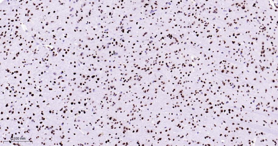 Paraformaldehyde-fixed, paraffin embedded Rat Cerebrum; Antigen retrieval by boiling in sodium citrate buffer (pH6.0) for 15 min; The section was incubated with Nucleolin Monoclonal Antibody, Unconjugated (bsm-62918R) at 1:200 overnight at 4°C, followed by conjugation to the bs-0295G-HRP and DAB (C-0010) staining.