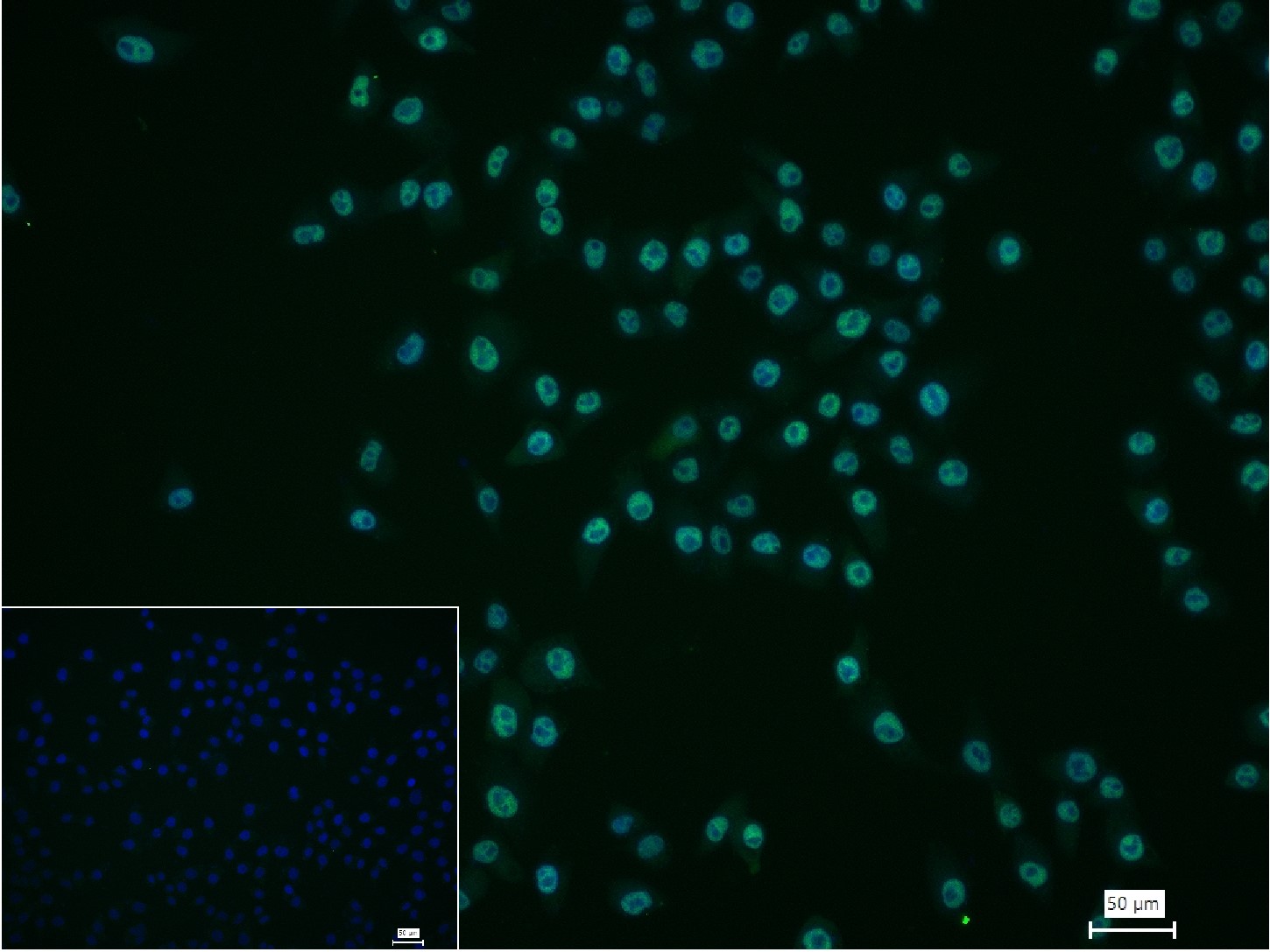 4% Paraformaldehyde-fixed Hela (H) cell; Triton X-100 at r.t. for 20 min; Antibody incubation with (Phospho-POLR2A (Ser5)) monoclonal Antibody, unconjugated (bsm-62940R) 1:100, 90 min at 37°C; followed by conjugated Goat Anti-Rabbit IgG antibody (green, bs-60295G-FITC) at 37°C for 90 min, DAPI (blue, C02-04002) was used to stain the cell nuclei. PBS instead of the primary antibody was used as the blank control.