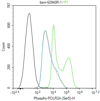 The Hela (H) cells were fixed with 4% PFA (10 min at r.t.) and then permeabilized with 90% ice-cold methanol for 20 min at -20℃,the cells then were incubated in 5%BSA to block non-specific protein-protein interactions (30 min at r.t.).Primary Antibody (green):Rabbit Anti-Phospho-POLR2A (Ser5) antibody (bsm-62940R): 1 μg/10^6 cells; Secondary Antibody (white blue): Goat anti-Rabbit IgG-FITC (bs-60295G-FITC): 1 μg/test. Isotype Control (orange): Rabbit IgG (bs-0295P). Blank control (black): PBS. Acquisition of 20,000 events was performed.
