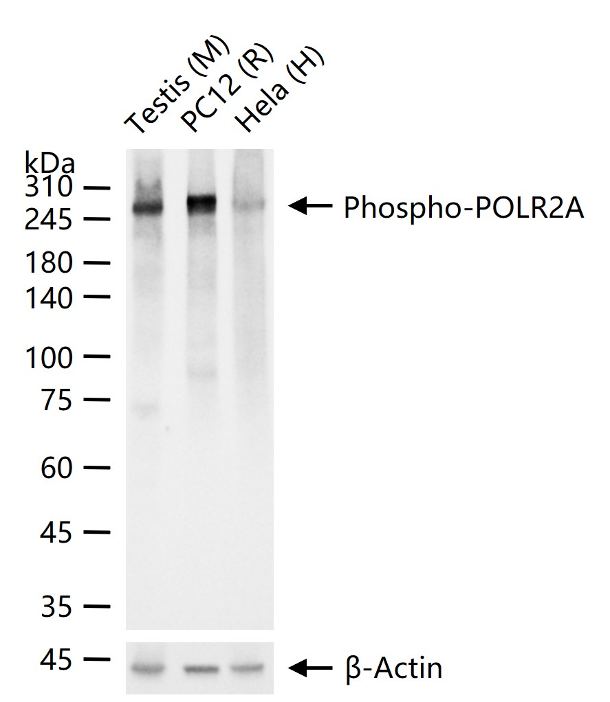 25 ug total protein per lane of various lysates (see on figure) probed with Phospho-POLR2A monoclonal antibody, unconjugated (bsm-62940R) at 1:2000 dilution and 4°C overnight incubation. Followed by conjugated secondary antibody incubation at r.t. for 60 min.