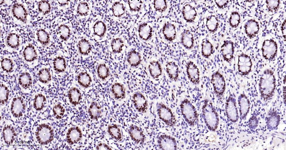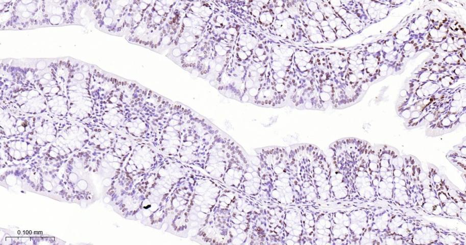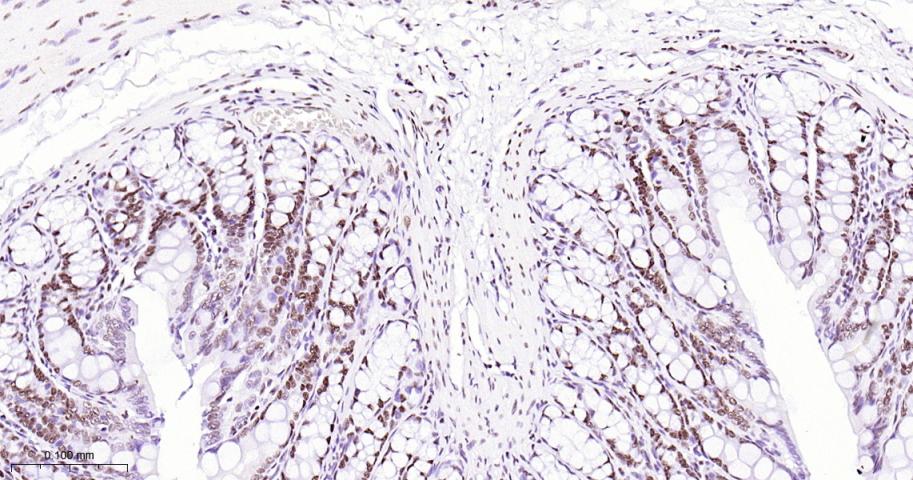 Paraformaldehyde-fixed, paraffin embedded Mouse Colon; Antigen retrieval by boiling in sodium citrate buffer (pH6.0) for 15 min; The section was incubated with Phospho-POLR2A (Ser5) Monoclonal Antibody, Unconjugated (bsm-62940R) at 1:200 overnight at 4°C, followed by conjugation to the bs-0295G-HRP and DAB (C-0010) staining.
